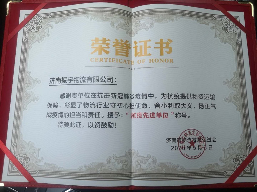 經(jīng)評(píng)選,振宇物流榮獲“抗疫先進(jìn)單位”,總經(jīng)理張憲振榮獲“抗疫愛心個(gè)人”!