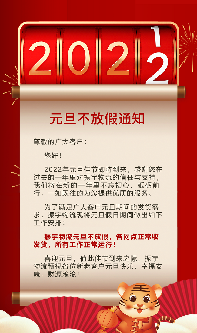2022年元旦佳節(jié)即將到來(lái),感謝您在過(guò)去的一年里對(duì)振宇物流的信任與支持,我們將在新的一年里不忘初心、砥礪前行,一如既往的為您提供優(yōu)質(zhì)的服務(wù)。