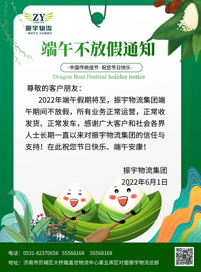 2022年端午假期將至,振宇物流集團端午期間不放假,所有業(yè)務(wù)正常運營,正常收發(fā)貨、正常發(fā)車,感謝廣大客戶和社會各界人士長期一直以來對振宇物流集團的信任與支持!在此祝您節(jié)日快樂、端午安康!