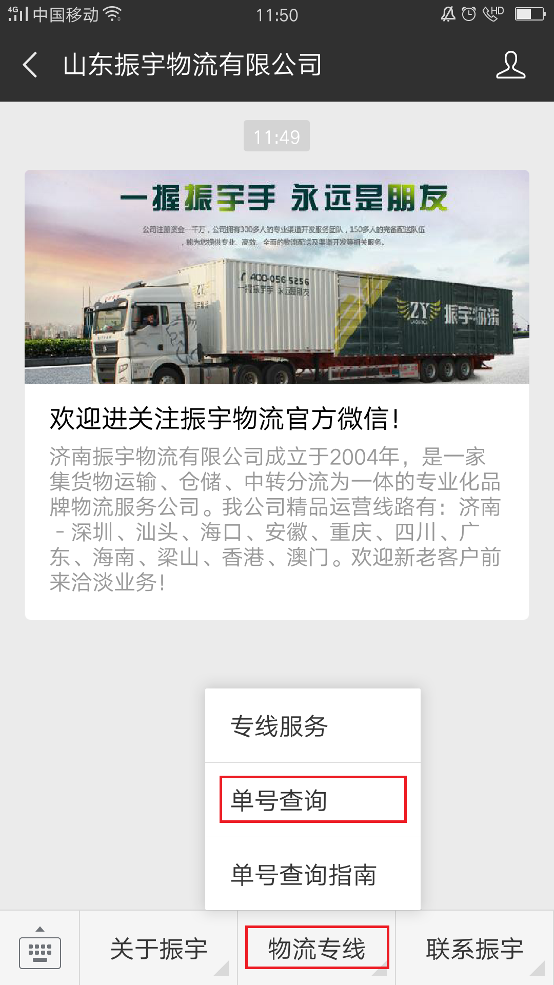 3.進(jìn)入公眾號(hào),點(diǎn)擊“物流專(zhuān)線——單號(hào)查詢(xún)”欄目。