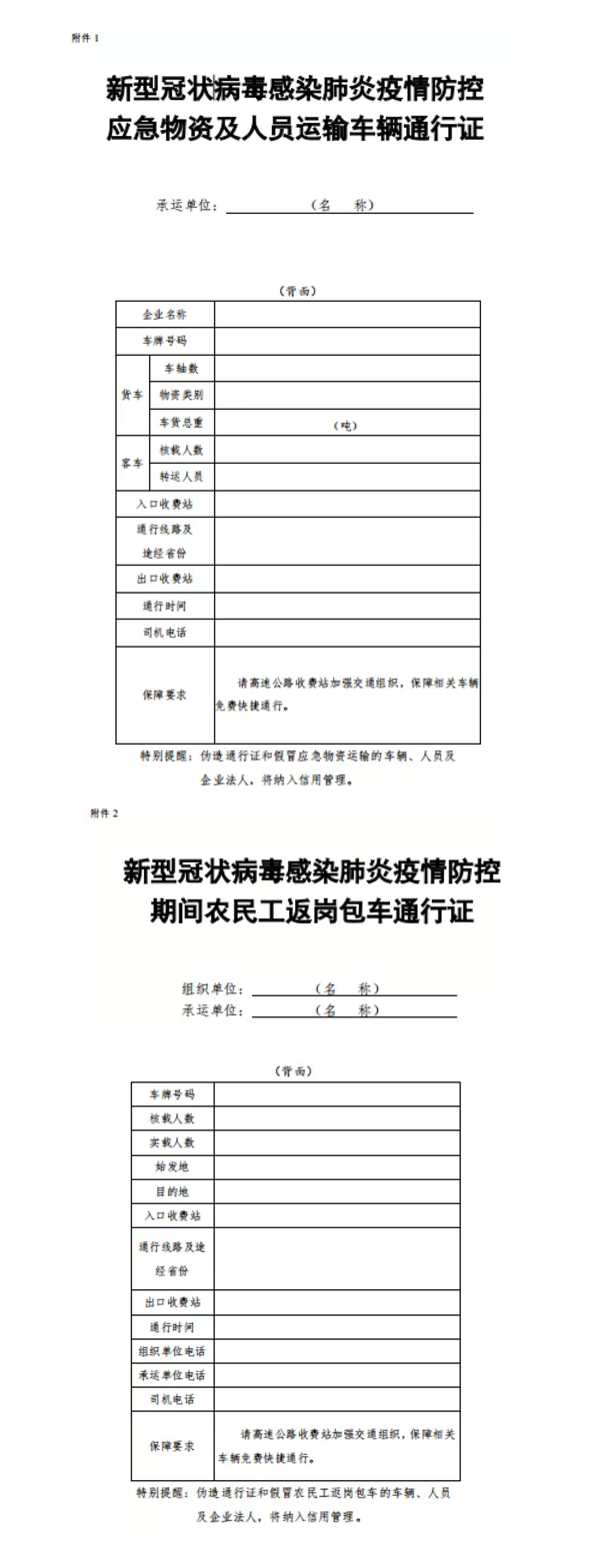 通知要求,地方各級交通運輸部門要認真落實《交通運輸部關(guān)于切實保障疫情防控應(yīng)急物資運輸車輛順暢通行的緊急通知》和《交通運輸部關(guān)于疫情防控期間免收農(nóng)民工返崗包車公路通行費的通知》要求,切實簡化“新型冠狀病毒感染肺炎疫情防控應(yīng)急物資及人員運輸車輛通行證”(簡稱“車輛通行證”)、“新型冠狀病毒感染肺炎疫情防控期間農(nóng)民工返崗包車通行證”(簡稱“包車通行證”)辦理流程,通過政府網(wǎng)站、微信、電子郵件等便捷方式提供“車輛通行證”“包車通行證”統(tǒng)一式樣,供承運單位或駕駛?cè)嗽诒镜刈孕写蛴 ⒆孕刑顚憽?/span>