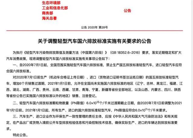 同時,公告表示,輕型汽車國六排放標準顆粒物數(shù)量(PN限值)6.0×1012個/千米過渡期截止日期由2020年7月1日前調(diào)整為2021年1月1日前。2021年1月1日起,所有生產(chǎn)、進口的國六排放標準輕型汽車,PN限值應符合6.0×1011個/千米要求。