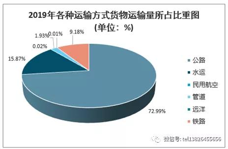 從貨物運輸?shù)姆绞嚼矗愤\輸仍然占據(jù)著我國貨物運輸行業(yè)的主導(dǎo)地位。2019年各種貨運運輸量中公路運輸量占比最大,達(dá)到了72.99%;其次為水運,占比為15.87%;鐵路運輸量占比9.18%,位居第三。我國民航運輸業(yè)起步較晚,仍處于發(fā)展階段,貨機數(shù)量整體來說相對較少,這導(dǎo)致2019年民航貨運量占比僅有0.02%。