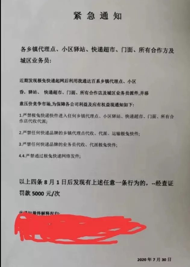 7月底,有某通達(dá)系快遞總部下發(fā)通知,要求全網(wǎng)各網(wǎng)點禁止代理極兔速遞業(yè)務(wù),通知指出,攬派兩端加盟公司不得以任何理由、任何形式代理極兔速遞業(yè)務(wù)。還有通知指出,如果通達(dá)百系中鄉(xiāng)鎮(zhèn)代理點、小區(qū)、驛站、快遞超市等業(yè)務(wù)員因惡性低價競爭攬收極兔速遞的,經(jīng)查證,每次予以5000元罰款。