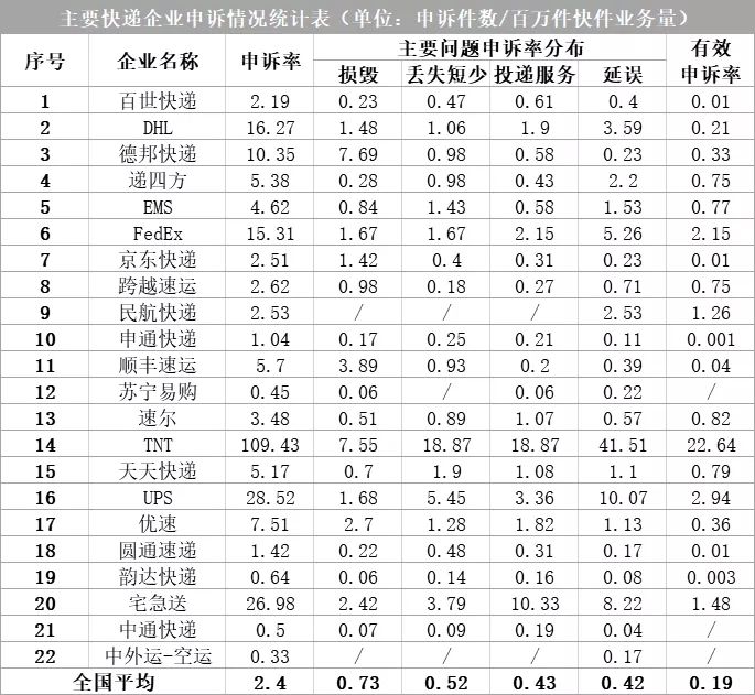 全國快遞企業(yè)申訴率(百萬件快件業(yè)務(wù)量)平均為2.40,有效申訴率平均為0.19。用戶對快遞企業(yè)申訴主要問題中,快件損毀申訴率平均為0.73,快件丟失短少申訴率平均為0.52,投遞服務(wù)申訴率平均為0.43,快件延誤申訴率平均為0.42。