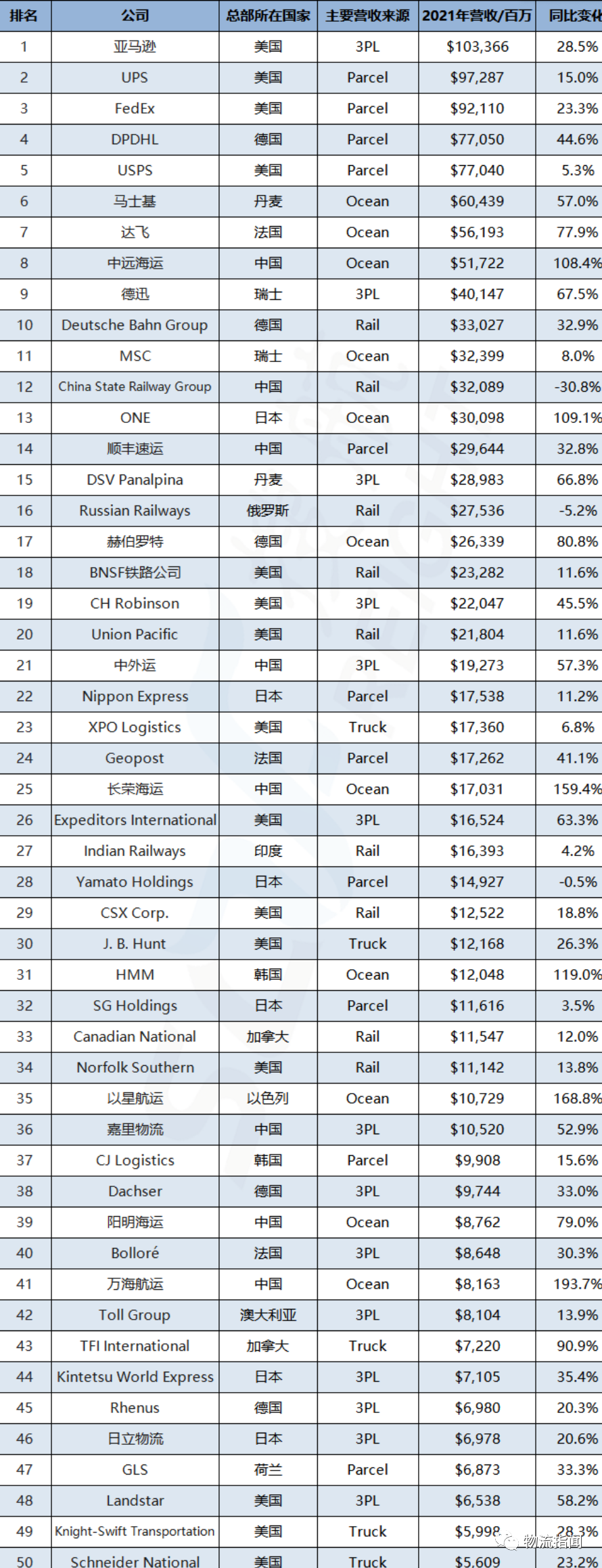 其中,有8家中國(guó)企業(yè)上榜。分別為中遠(yuǎn)海運(yùn)(第8位,51722百萬(wàn)美元)、中國(guó)國(guó)家鐵路集團(tuán)(第12位,32089百萬(wàn)美元)、順豐速運(yùn)(第14位,29644百萬(wàn)美元)、中外運(yùn)(第21位,19273百萬(wàn)美元)、長(zhǎng)榮海運(yùn)(第25位,17031百萬(wàn)美元)、嘉里物流(第36位,10520百萬(wàn)美元)、陽(yáng)明海運(yùn)(第39位,8762百萬(wàn)美元)、萬(wàn)海航運(yùn)(第41位,8163百萬(wàn)美元).